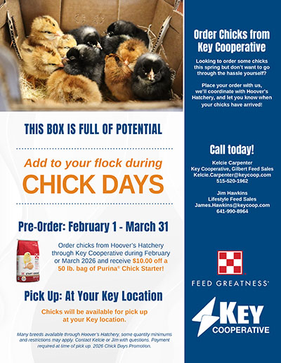 Order chicks from Hoover’s Hatchery through Key Cooperative during February or March 2026 and receive $10.00 off a 50 lb. bag of Purina® Chick Starter!