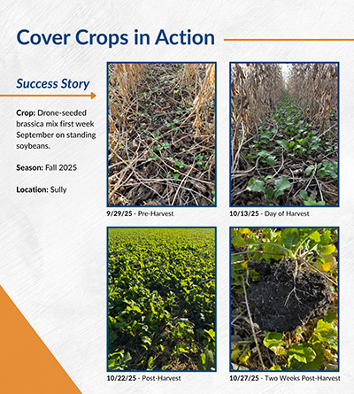 Drone-seeded brassica mix first week September on standing soybeans.