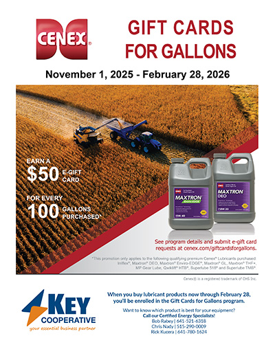 Earn a $50.00 e-gift card for every 100 gallons of Cenex Lubricants purchased*.