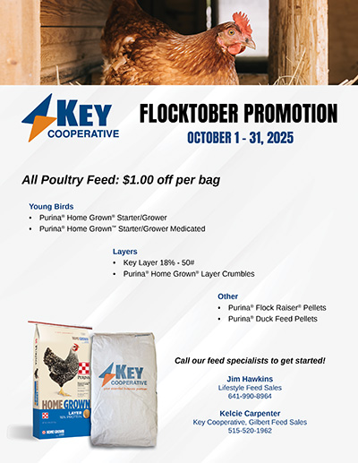 Enjoy special pricing on poultry feed from Key Cooperative during the month of October, also known around here as Flocktober! Receive $1.00 off per bag of select poultry feeds October 1 - October 31, 2025. See the list below for qualifying items.