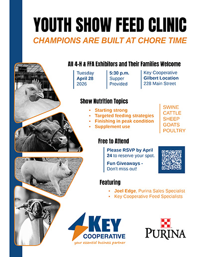Calling all 4-H and FFA members and their families! You're invited to join us for a free show feed clinic on April 28 at our Gilbert location. Purina Sales Specialist, Joel Edge will be our guest speaker and cover a number of topics including feeding strategies and supplement use. Supper and refreshments will be provided and you can enter to win drawings for free feed products! Please RSVP by April 24.