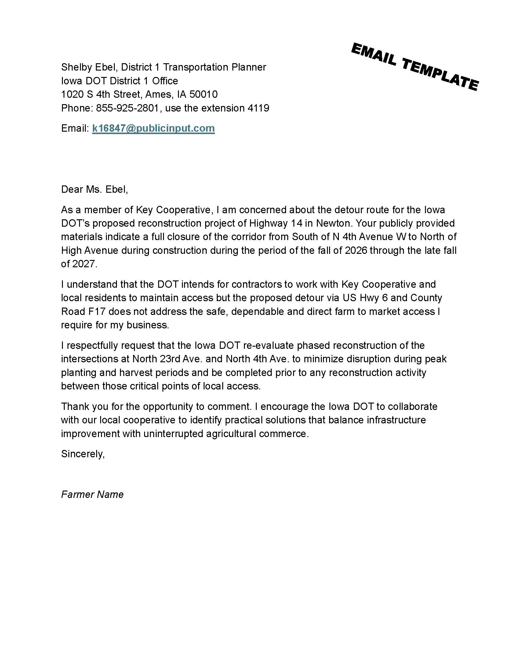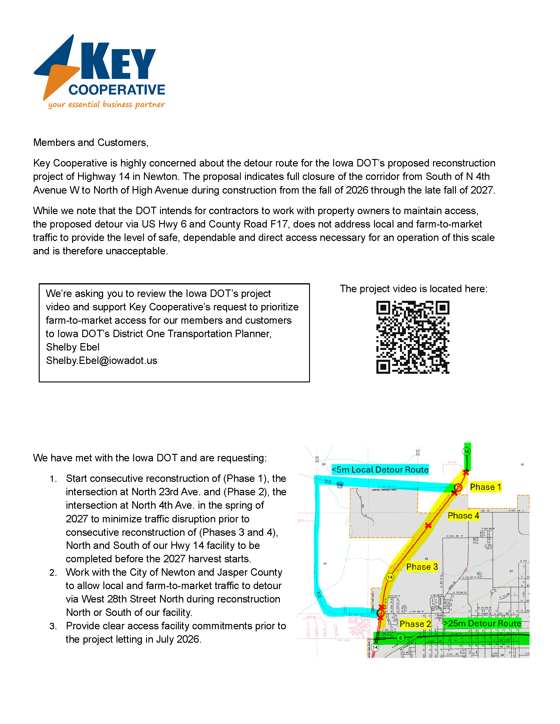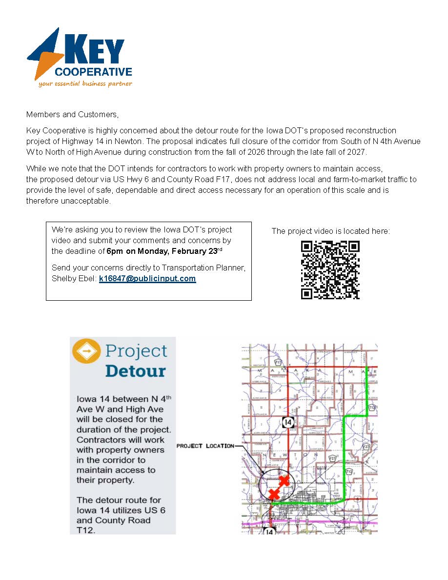 Key Cooperative is highly concerned about the detour route for the Iowa DOT’s proposed reconstruction project of Highway 14 in Newton. The proposal indicates full closure of the corridor from South of N 4th Avenue W to North of High Avenue during construction from the fall of 2026 through the late fall of 2027.
